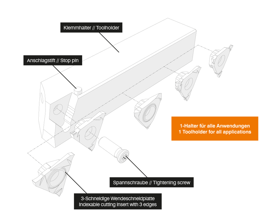 The tool concept is enhanced by cutting inserts available at very low net prices per ground cutting edge.